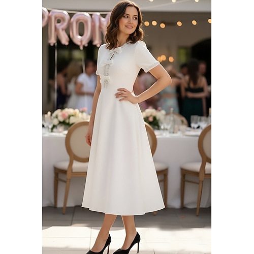 Linea ad A Lunghezza Tè Abito da Ballo Vestito da Festa Abito da Cocktail Abiti da sposa Abito da sposa Elegante Vintage Piccoli Abiti Bianchi Manica Corta Girocollo Formale Laurea Crepe Elasticizzato