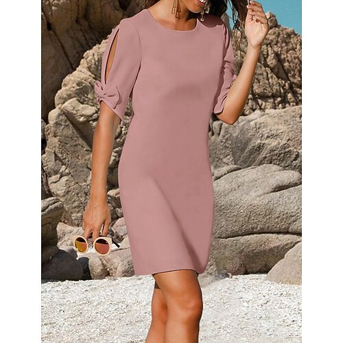 Abito da cocktail Sheath Ospite di matrimonio Elegante Semplice Scollo gioiello Corto Mini Chiffon Maniche corte con Fiocchi Colore solido Abiti taglia personalizzata gratuita