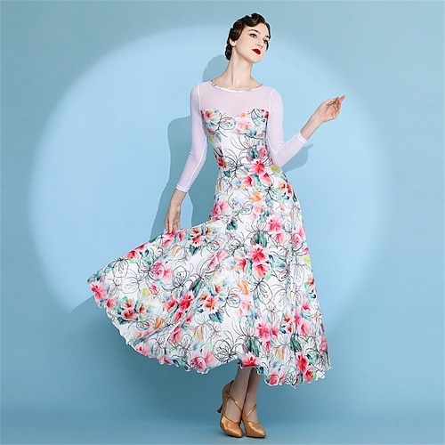 abito da ballo da sala con stampa floreale per donna - abito a trapezio a maniche lunghe con eleganti maniche trasparenti per competizioni, eventi di ballo latino e danza - bluamp; bianco
