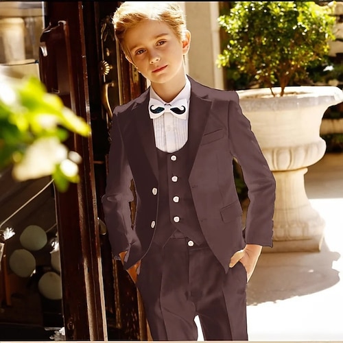 Completo da fedi per bambini, 5 pezzi, blazer pantaloni camicie cravatta ragazzo abito formale casual esterno festa moda fresco basic tinta unita tasca bottoni nero vino viola poliestere