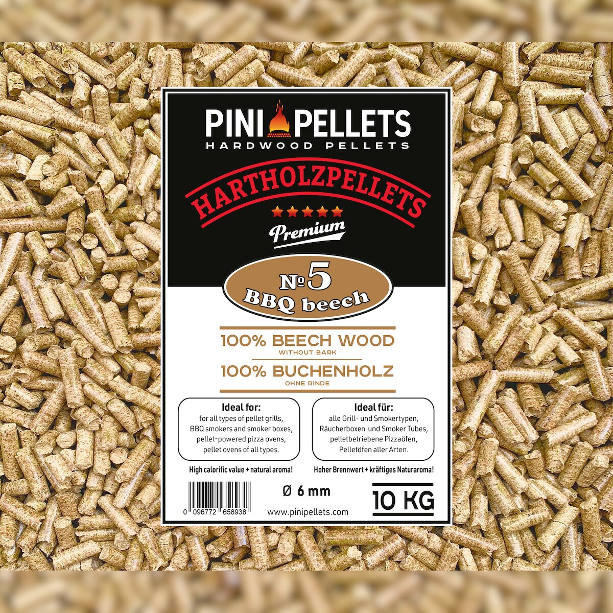 PINI Hartholz Pellets 100% Buche Nr. 5 BBQ Beech 10 Kg Grillpellets zum Grillen Räuchern Smoken