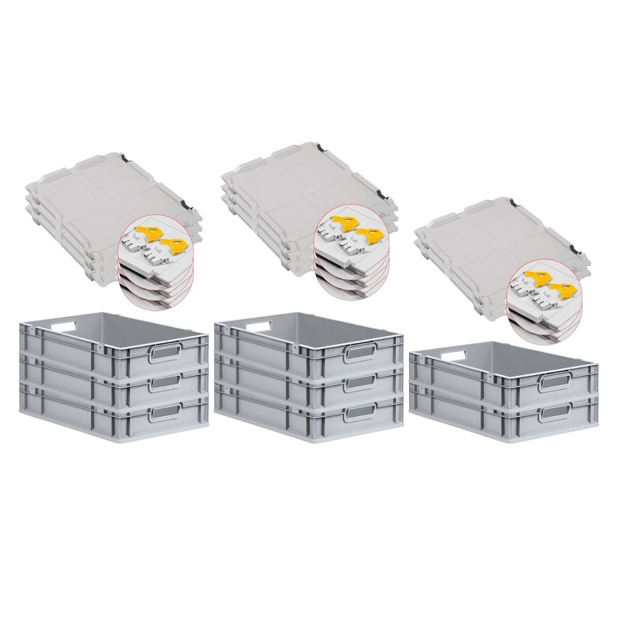 PROREGAL 10x Eurobox NextGen Grip mit Scharnierdeckel & gelben Verschlüssen | HxBxT 12x40x60cm | 23 Liter | Griffe offen | Glatter Boden