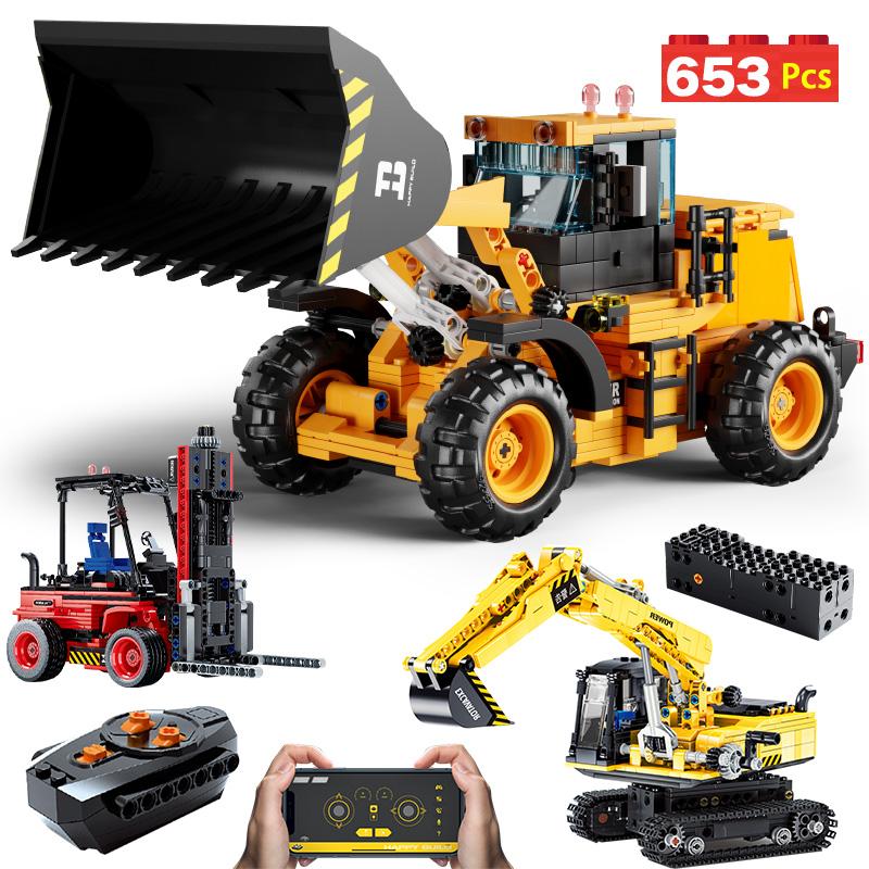 By RC Gravemaskin APP Byggeklosser Bulldoser Kran Fjernkontroll Gaffeltruck Bil Lastebil Klosser Leker For Barn Gutter