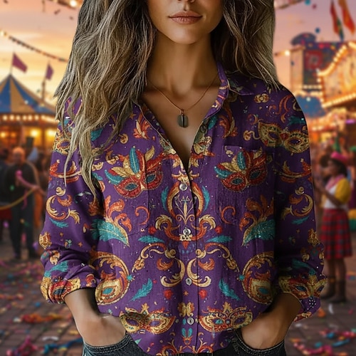 Carnevale Martedì grasso Per donna Camicia Camicia Boho Bottoni Stampato Grafico Vintage Elegante Etnico Manica Lunga Colletto a Camicia Top Regolari Quotidiano Ferie Uscire Viola chiaro Viola Estate