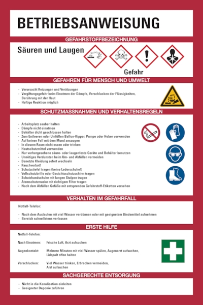 Aushang, Betriebsanweisung für Säuren & Laugen - GHS/ISO 7010 Piktogramme - 200x300x1.5 mm Kunststoff
