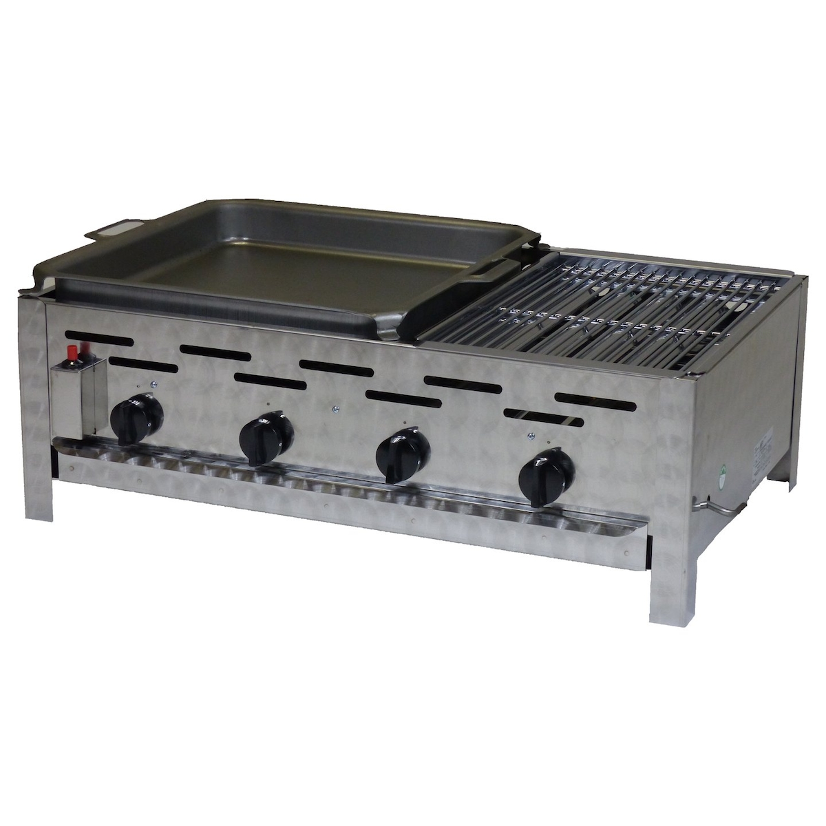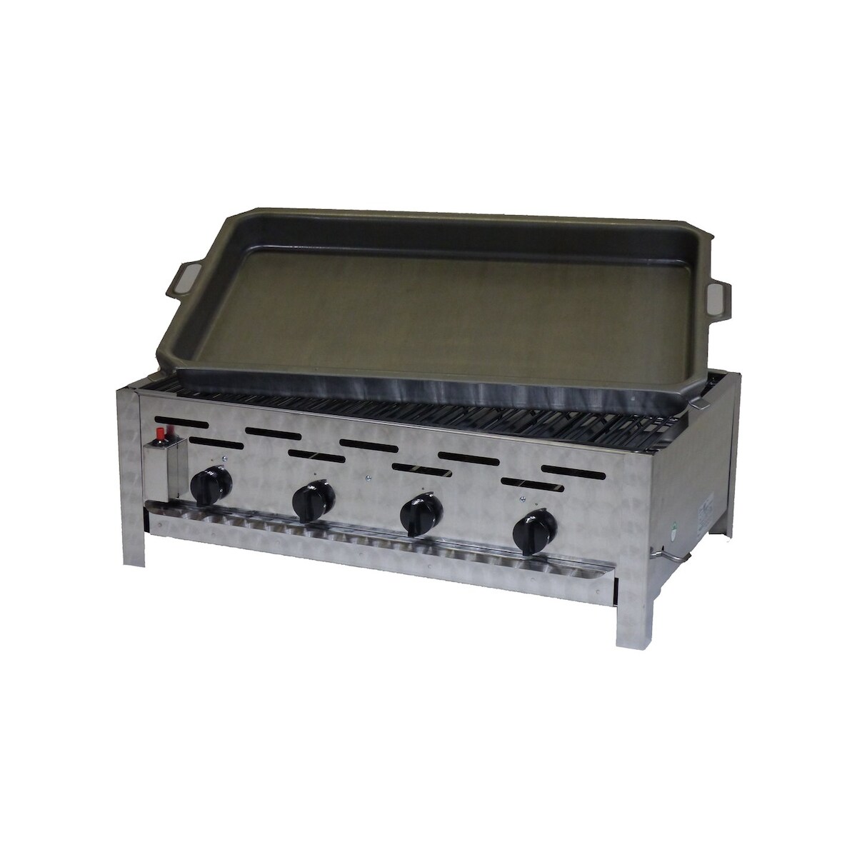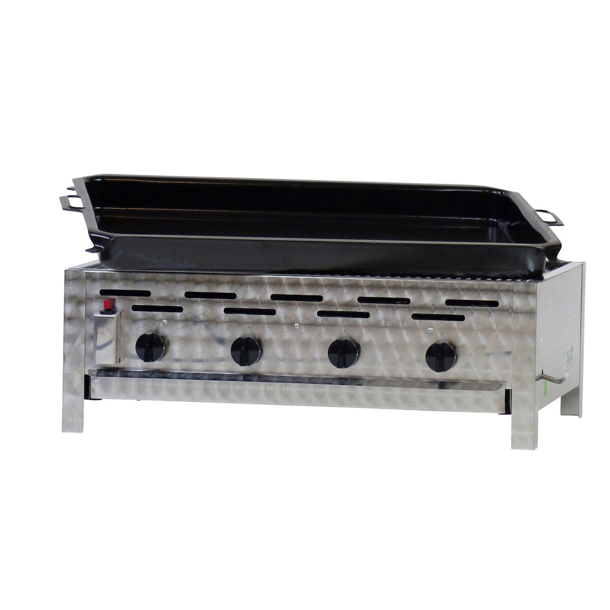 Gastrobräter, 4 Brenner je 3,6 kW, mit Grillrost und Stahlpfanne, B 810 x T 530 x H 270 mm, inkl. Gewerbedruckregler u. Schlauchbruchsicherung