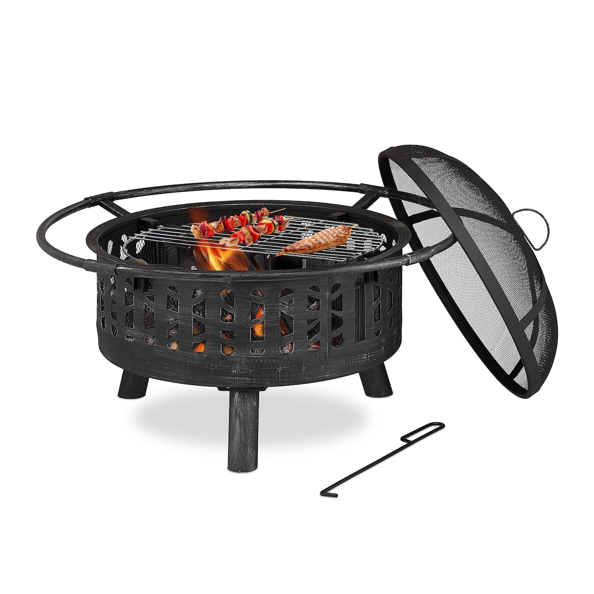 Relaxdays Feuerschale mit Grillrost & Funkenschutz, Schürhaken, Kohlerost, Ø 75 cm, Feuerstelle Garten, schwarz/silber