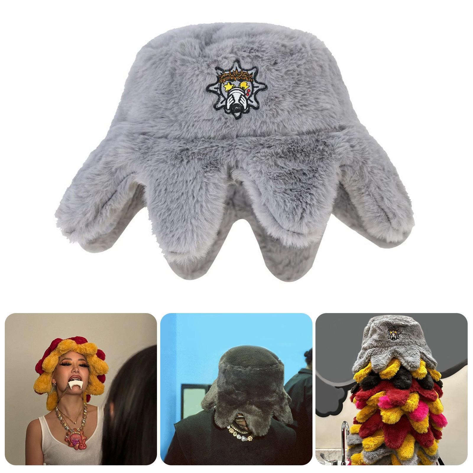 Stylish Plush Octopus Bucket Hat Comfortable Wear Novelty Animal Shape Bucket Hat Warm Winter Bucket Hat For Women Men black