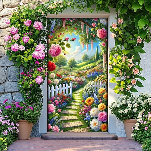 Copertura per porta con roseto, stampa piatta 2D con percorso di staccionata e design di fiori in fiore, elegante decorazione per l'ingresso di casa, perfetta per la porta d'ingresso o la decorazione