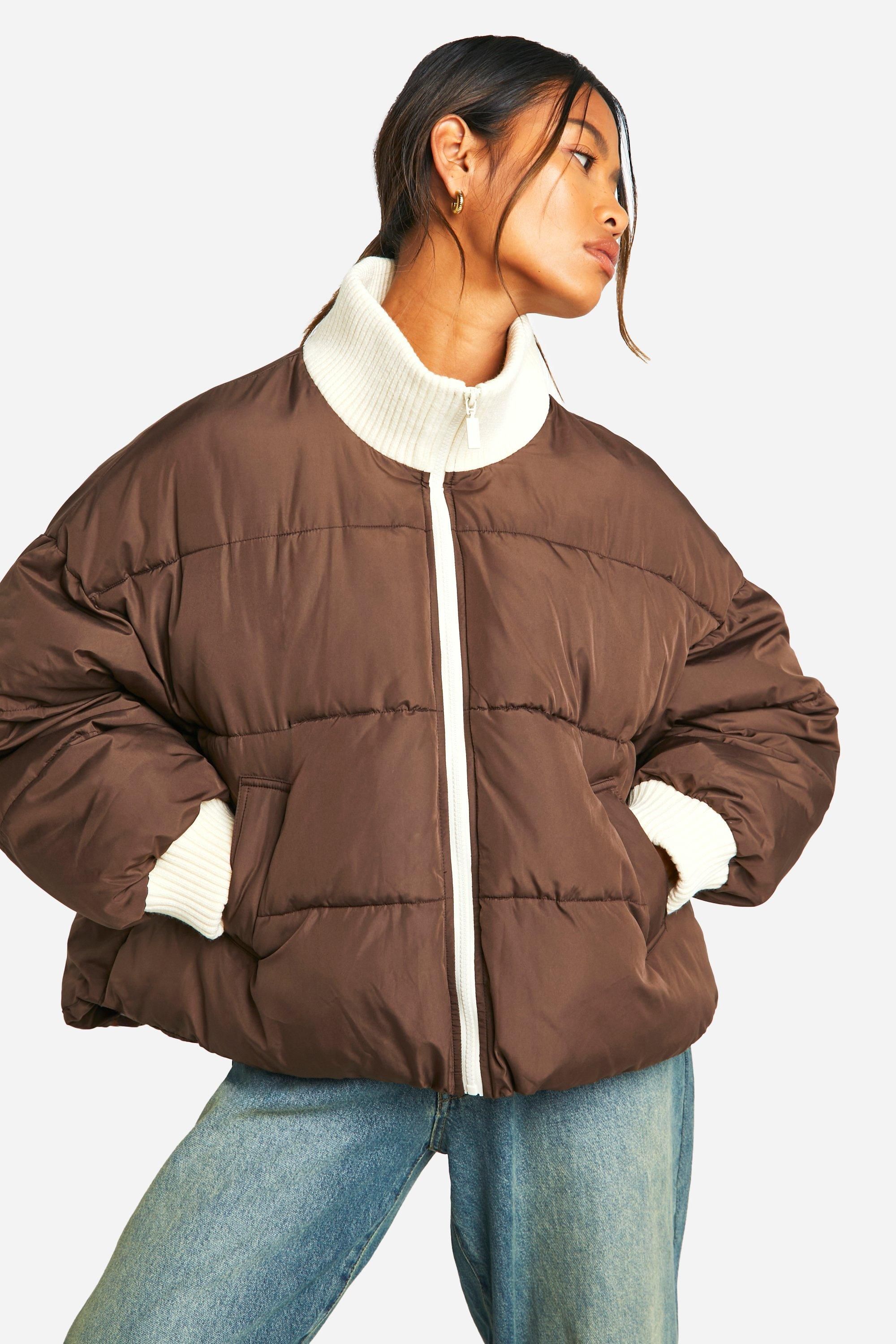 Boohoo Womens Contrast Rib Puffer Jacket - Chocolate - Size 14 UK | Boohoo Sale | Discount Designer Brands