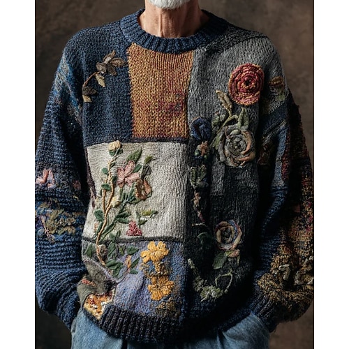 Per uomo Maglione Maglione a maglia A Coste Maglia Top Regolari Lavorato a maglia Stampato Stampa Floreale Girocollo Vintage Rustico Vacanza Abbigliamento quotidiano Abbigliamento Autunno Inverno Blu