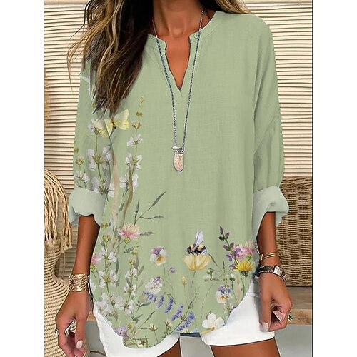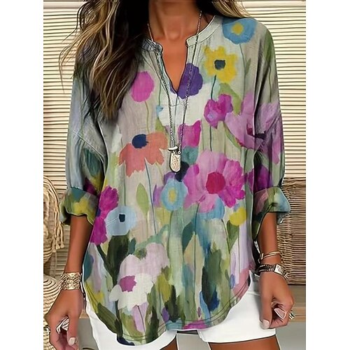 Per donna Plus Size maglietta Color Block Essenziale Manica lunga A V Maglie lunghe Informale Fine settimana Bottoni Tunica fluente Blu Arancione Verde Grigio Autunno inverno