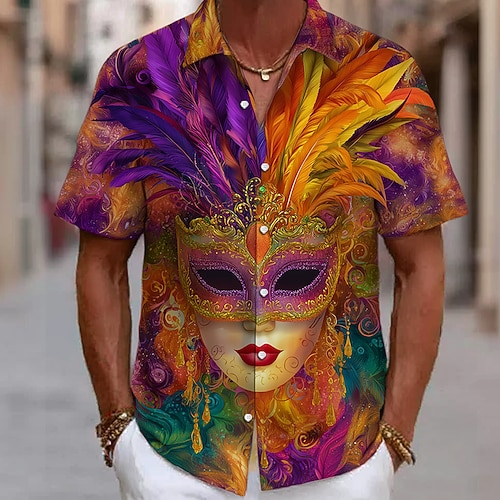Martedì grasso Per uomo Colore abbagliante Carnevale Maschera con piume Camicia Camicia con Bottoni Manica Corta Vintage Retrò Feste Ferie Estate Primavera Collo ripiegato Stampa 3D camicie con