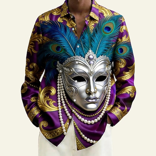 Martedì grasso Per uomo Carnevale Maschera con piume Camicia Camicia in raso Camicia elegante Manica Lunga Moda Casual Feste Ferie Estate Primavera Collo ripiegato Stampa 3D Camicie con bottoni Viola