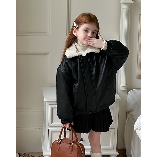 Bambini Ragazze Giacca in pelle nera Giacca in pile Giacca di pelle Tinta unica Moda Cerniera Tasca Tenere al caldo Antivento All'aperto Cappotto Capispalla 4-12 Anni Autunno Nero