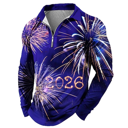 Capodanno Per uomo Fuochi d'artificio Polo Manica Lunga Magliette polo Bavero Casual Abbigliamento quotidiano Abito da festa Stampa 3D Polo con cerniera a un quarto Primavera Autunno Inverno Blu
