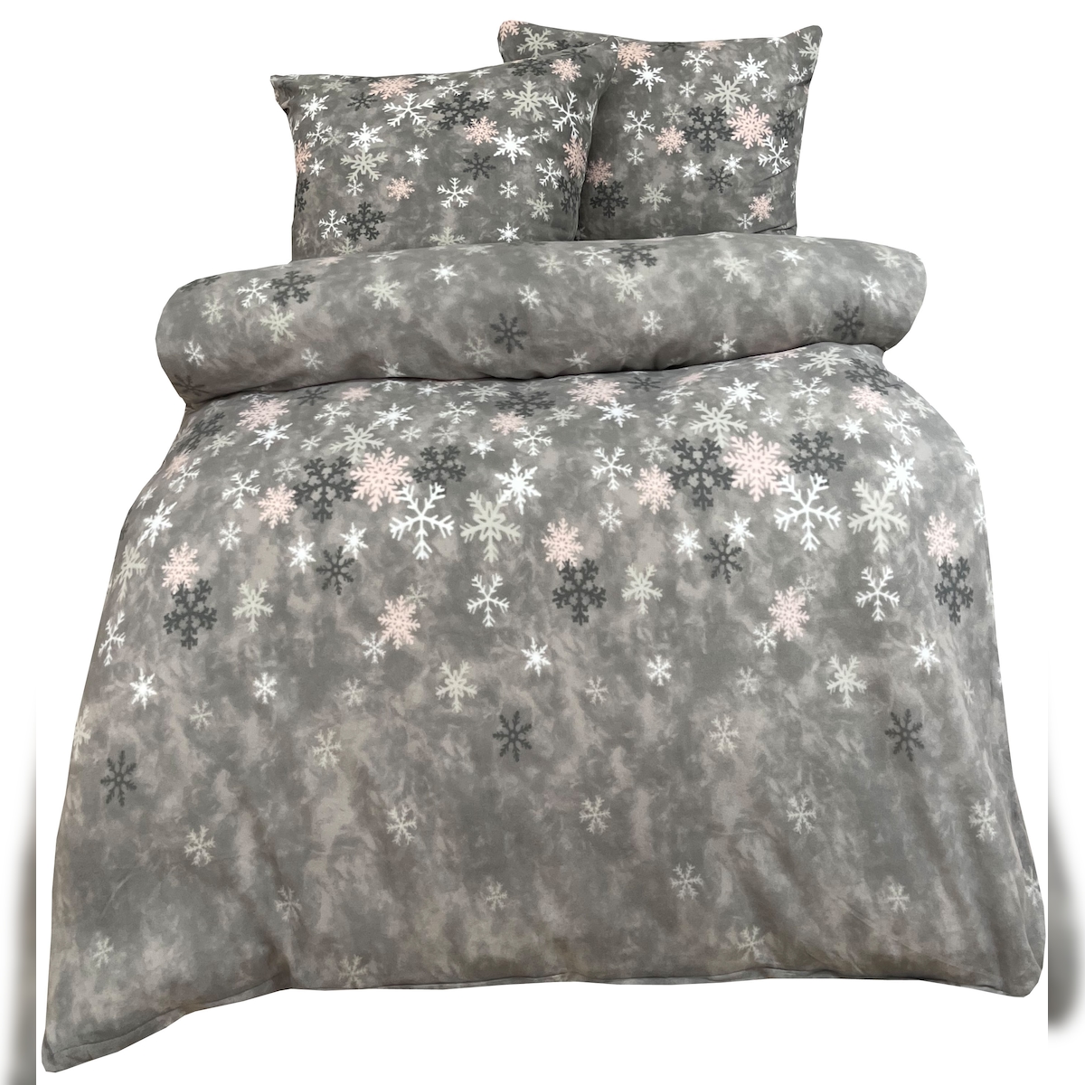 Leonado Vicenti Bettwäsche Thermofleece 200x200 + 2x 80x80 cm grau rosa Schneeflocken mit Reißverschluss / 3 tlg.