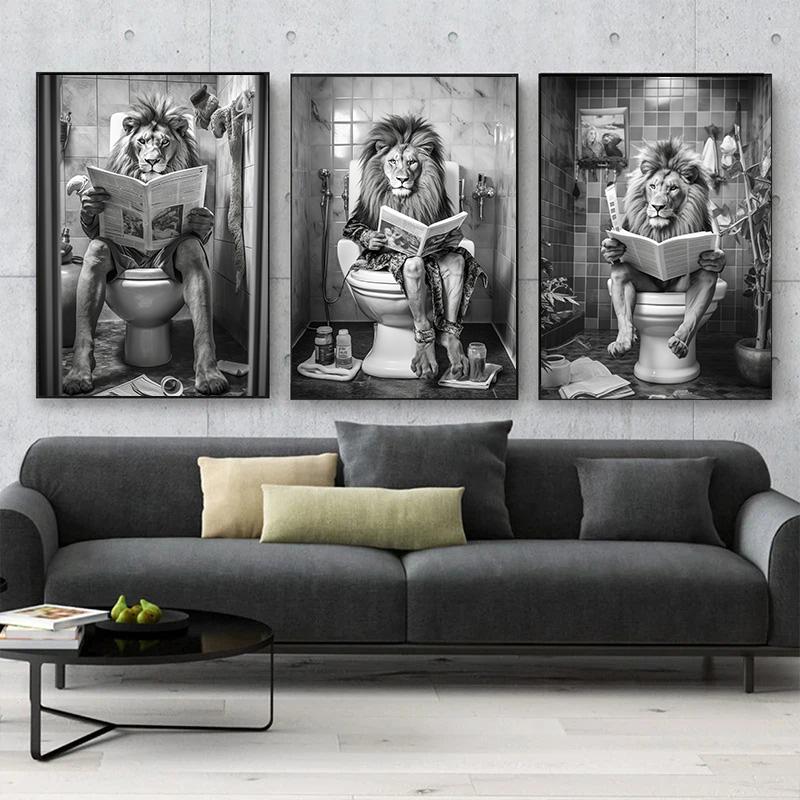 Funny Bathroom Humor Poster Lion Sitting on The Toilet Reading A Newspape Artwork Painting Room Office Cafe Home Wall Decors