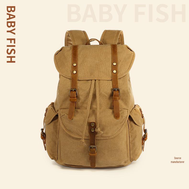 Sac à dos rétro en toile lavée avec garniture en cuir de vache pour les sports de plein air café
