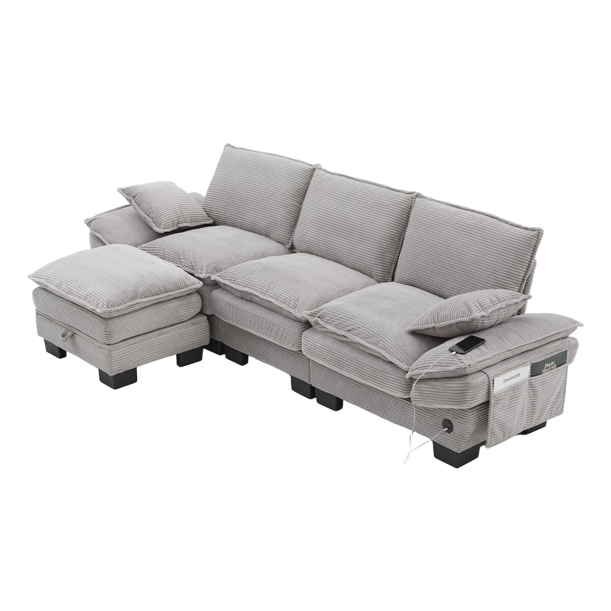 Merax 3-Sitzer-Sofa mit Hocker, USB-C-Anschluss & Seitentaschen, Dicke Kissen, Corduroy, Hellgrau