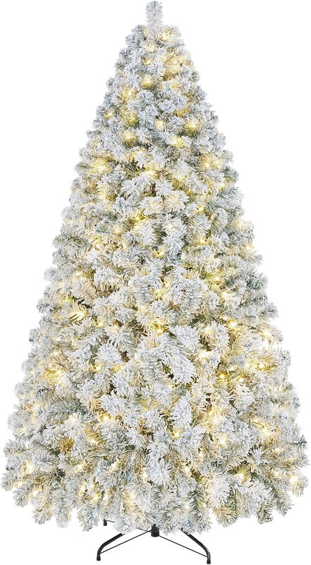 Yaheetech 2,1 m Vorgeschmückter Flocken-Kunstweihnachtsbaum mit 350 warmweißen LED-Lampen, 8 Beleuchtungsmodi und 1000 PVC-Zweigen, Scharniertanne, mit Ständer, Grün & Weiß