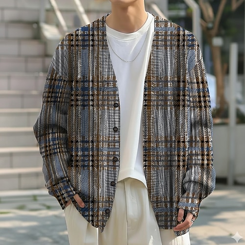 Per uomo Plaid Blocco di colori Cardigan Scollo a V Casual Scuola Vacanza Quotidiano Stampa 3D Tenere al caldo Manica Lunga Primavera Autunno Inverno Marrone