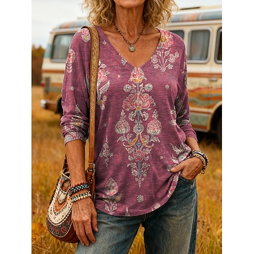 Per donna Maglietta Grafico Piante Vintage Elegante Casual Manica Lunga Scollo a V Top Regolari Quotidiano Stampato Rosa Rosso Viola Primavera Autunno