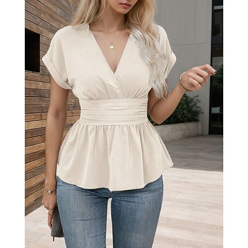 maglietta da donna tinta unita elegante moda manica corta scollo a V top normali tutti i giorni per uscire fine settimana patchwork tunica nero vino verde militare blu navy estate primavera