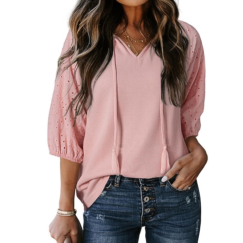 Per donna Blusa Semplice Elegante Manica 3/4 Scollo a V Top Regolari Quotidiano Ferie Uscire Patchwork Traforato Nero Bianco Verde chiaro Rosa Blu marino Primavera Autunno