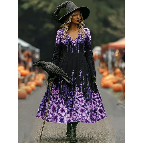 Abito Maxi da donna Stampa Strega Vestito A-Line Vacanza Casual Boho Spiaggia Vestibilità Regolare Grafica Floreale Hocus Pocus Manica Lunga V Collo Giallo Verde Scuro Viola Arancione Primavera