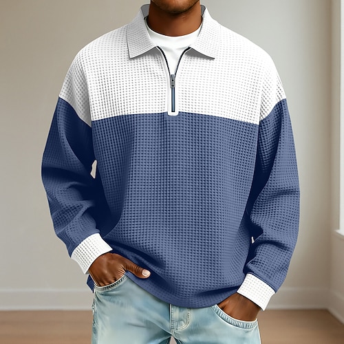 Per uomo Polo con zip a un quarto Polo in cotone Giornaliero Per eventi Chiusura lampo quarto Manica lunga Di tendenza Moderno Color Block Collage Primavera Autunno Standard Bianco Vino Blu reale