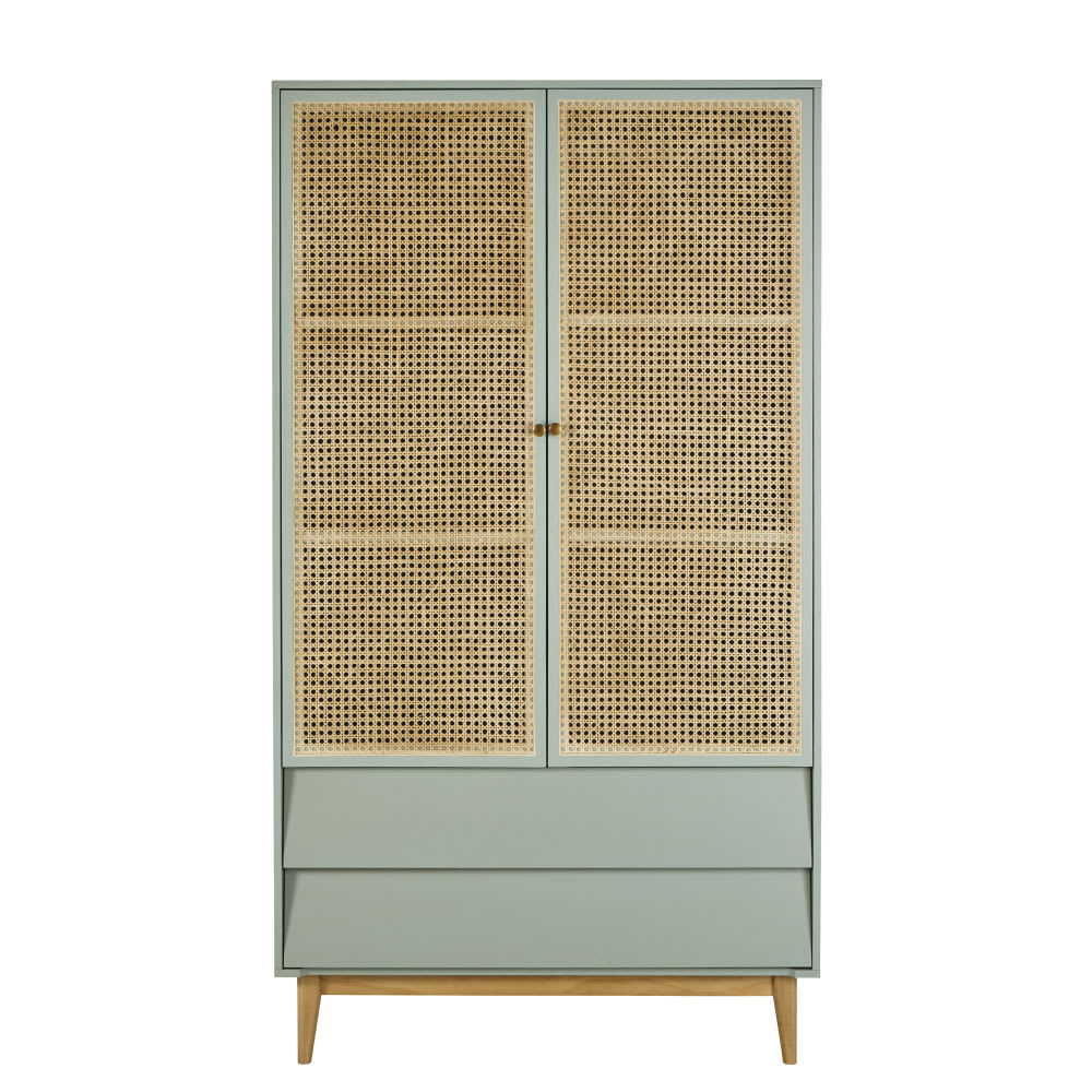 Armoire 2 portes 2 tiroirs bleu gris cannage en rotin L105