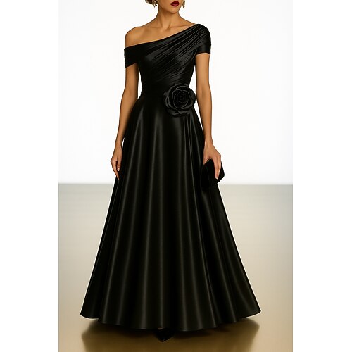 Linea ad A Lunghezza al pavimento Abito da Sera Da principessa Abito formale Elegante Manica Corta Monospalla Matrimonio Formale Raso Elasticizzato con Pieghe