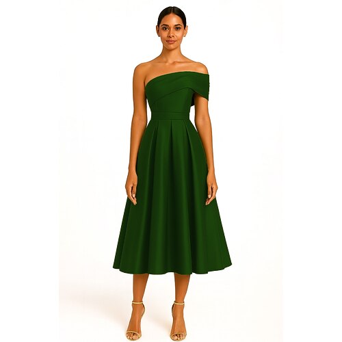 Linea ad A Tubino Colonna Lunghezza Tè Abiti da Cocktail Elegante Senza Maniche Senza Spalle Festa in giardino Matrimonio Raso Elasticizzato con Pieghe