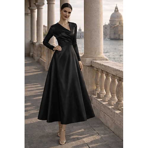 Linea ad A Lunghezza alla caviglia Abiti da Cocktail Elegante Manica Lunga Scollo a V Festa in giardino Matrimonio Raso Elasticizzato con Pieghe
