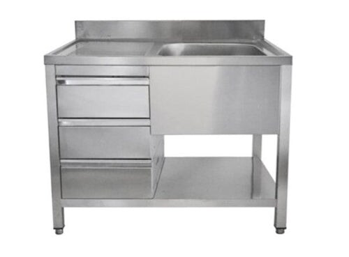 VM Europa Edelstahl Spültisch 1 Becken rechts, 3 Schubladen links, mit Grundboden, mit Aufkantung, Premium : 140 x 70 cm / mit Aufkantung / fertig montiert