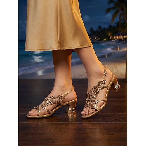 sandali da donna con tacco basso e strass dorati - eleganti scarpe con cinturino posteriore e ritagli floreali con comodi tacchi a blocco, perfetti per la mamma della sposa in stile rustico matrimoni