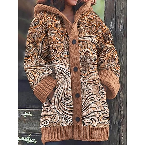 Per donna Cardigan Vacanza Vintage Quotidiano Floreale A Coste Con Cappuccio Lavorato a maglia Stampato Tasca Frontale Manica Lunga Top Regolari Maglia All'aperto Quotidiano Ferie Blu Marrone Autunno