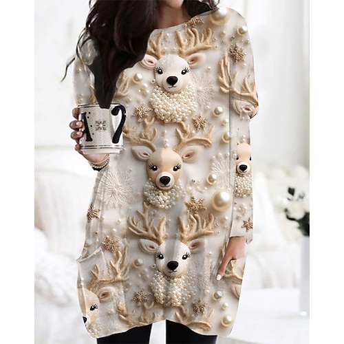 Per donna Mini Abito Abito di Natale Abito Stampato Moda Moderno Quotidiano All'aperto Vacanza Vestibilità regolare Cervo Manica Lunga Girocollo Beige Autunno Inverno
