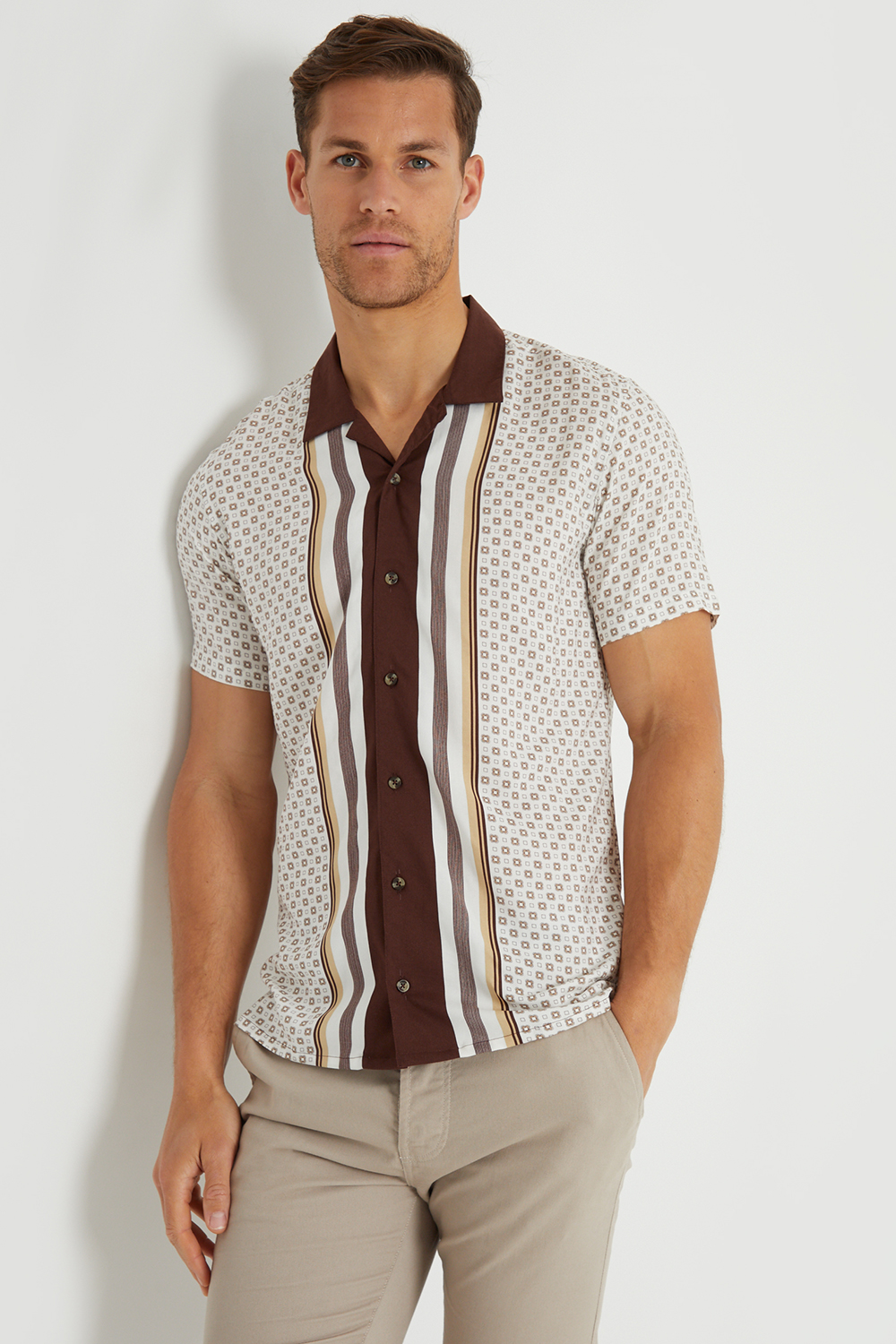 Threadbare Mens Brown 'hallfield' Stripe Geo Print Revere Collar Short Sleeve Shirt - Size Large | Threadbare Sale | Discount Designer Brands