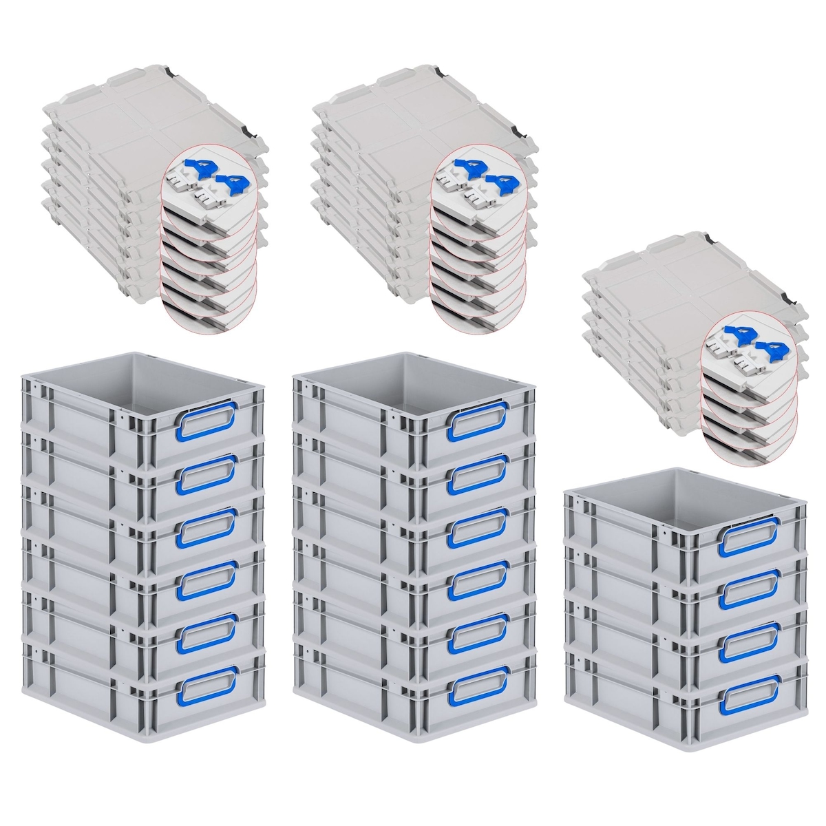 PROREGAL 16x Eurobox NextGen Color mit Scharnierdeckel & Verschlüssen | HxBxT 12x30x40cm | 11 Liter | Griffe blau geschlossen | Glatter Boden