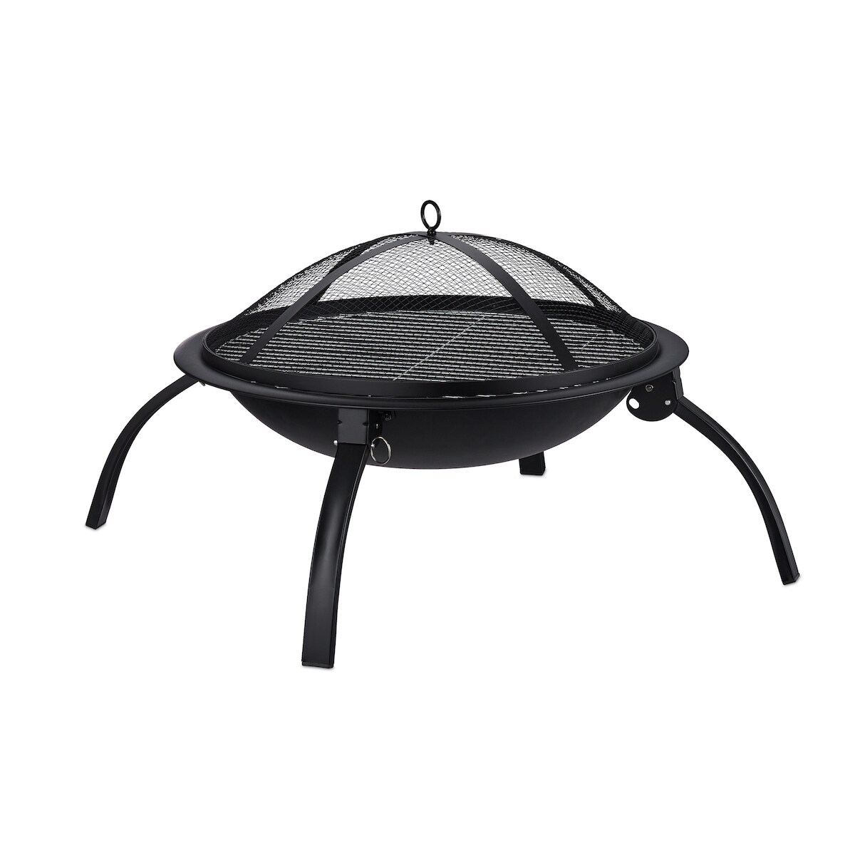 Relaxdays XL Feuerschale, Grill Rost, Schürhaken, Funkenschutz Deckel, Garten, Terrasse, Feuerstelle D 56,5 cm, schwarz