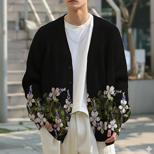 Per uomo Floreale Cardigan Scollo a V Casual Scuola Vacanza Quotidiano Stampa 3D Tenere al caldo Manica Lunga Primavera Autunno Inverno Nero
