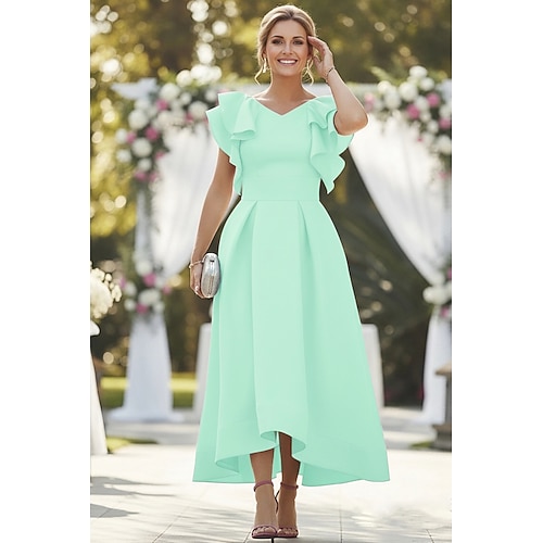 Linea ad A Asimmetrico Vestito da Festa Abito da Cocktail Abito da invitata a nozze Abito da cerimonia per signora Manica Corta Scollo a V Elegante Alto Basso Raso con Volant