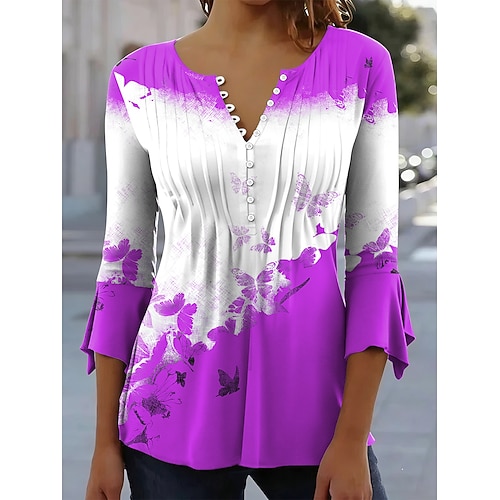 Per donna Blusa Ombre Grafico Farfalla Elegante Manica 3/4 Girocollo Top lunghi Quotidiano Uscire Volant Bottoni Nero Rosso Viola Marrone Primavera Autunno