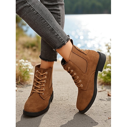 stivaletti allacciati marroni da donna - stivali bassi stile combattimento, calzature casual da esterno per l'autunno, i viaggi e l'uso quotidiano