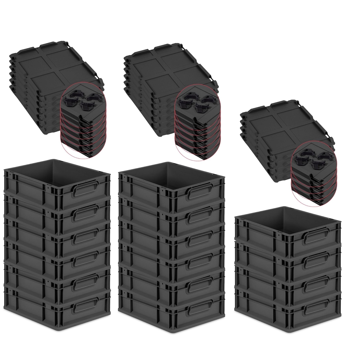 PROREGAL SparSet 10x Eurobox NextGen Grip mit Auflagedeckel & 4 gelben Verschlüssen, HxBxT 12x30x40cm, 11L, Schwarz, Griffe offen, Eurobehälter