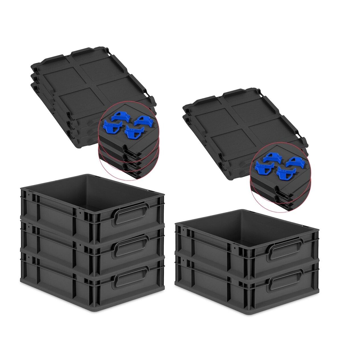 PROREGAL SparSet 5x Eurobox NextGen Grip mit Auflagedeckel & 4 blauen Verschlüssen, HxBxT 12x30x40cm, 11L, Schwarz, Griffe zu, Eurobehälter