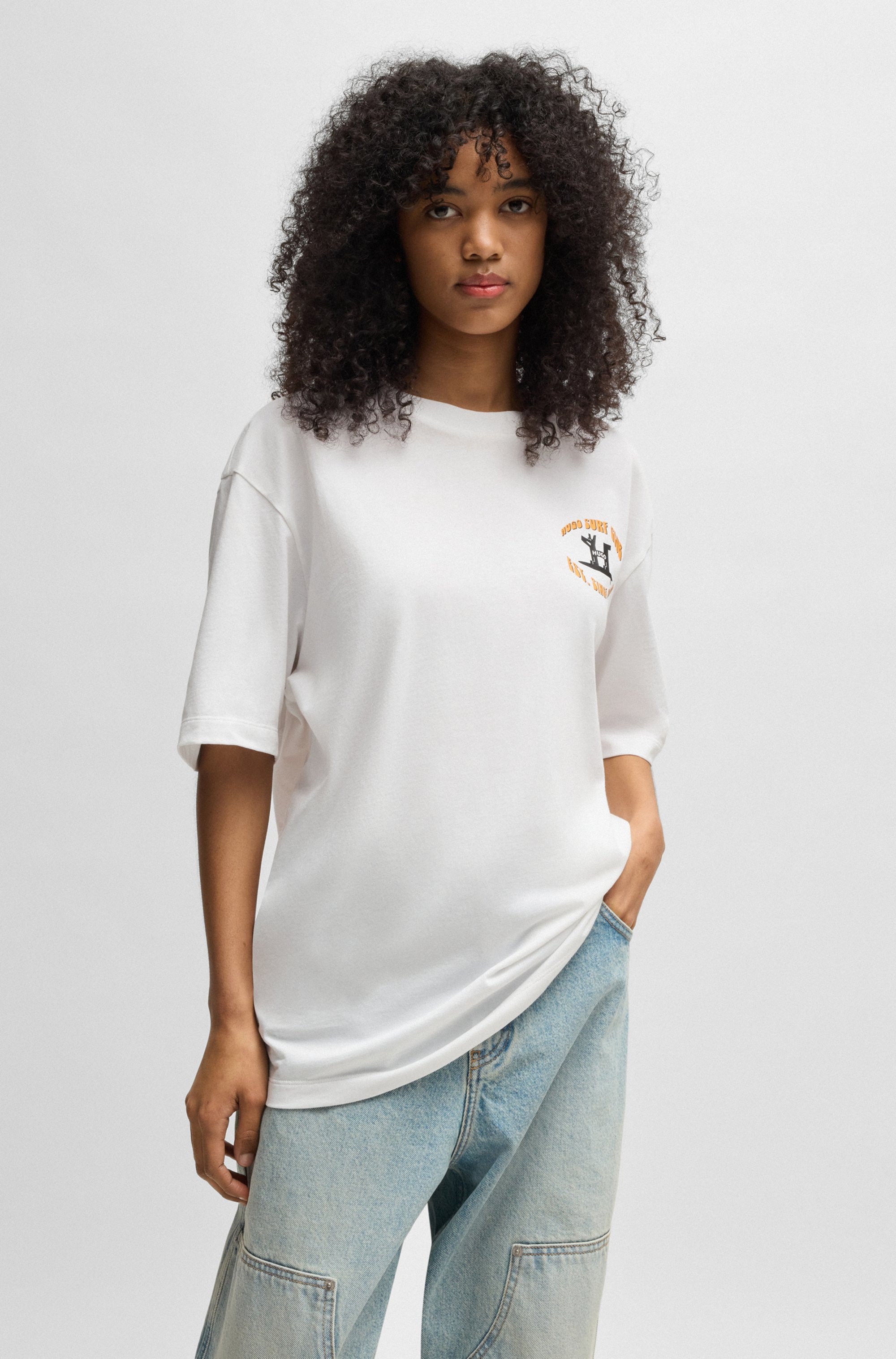 T-Shirt HUGO BLUE "Nico", Damen, Gr. M, weiß (weiß100), Single Jersey, Obermaterial: 100% Baumwolle, unifarben, regular fit hüftlang, Rundhals, Shirts T-Shirt, mit großem Logo-Print, Unisex