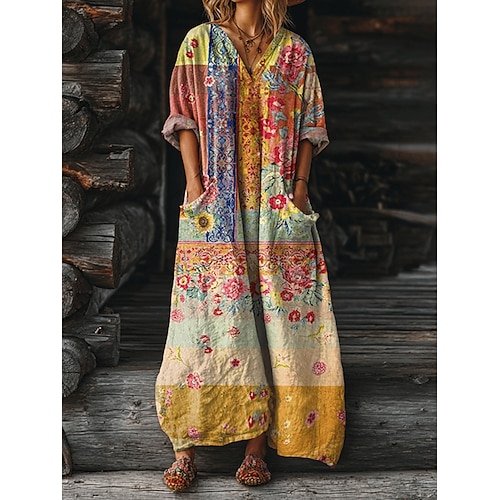 Abito Maxi da Donna Boho Vestito A-Line Vacanza Casual Quotidiano Vestibilità Larga Grafica Floreale Manica Lunga V Collo Giallo Verde Estate Primavera